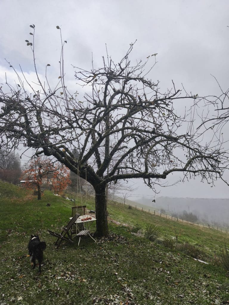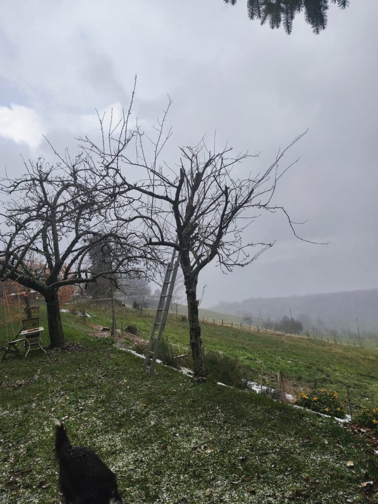 Taille d'un vieux pommier, suppression des gourmands et du bois mort, léger rabattage en hauteur et en largeur tout en gardant une forme naturel